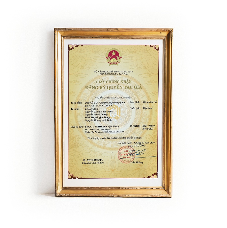 Là thành quả nghiên cứu và áp dụng tại Vietop trong nhiều năm, E.M.P.O.W.E.R® đã giúp hàng ngàn học viên bứt phá band điểm, đồng thời được chính thức công nhận Sở hữu trí tuệ tại Việt Nam – khẳng định giá trị khác biệt và tính khoa học của phương pháp.