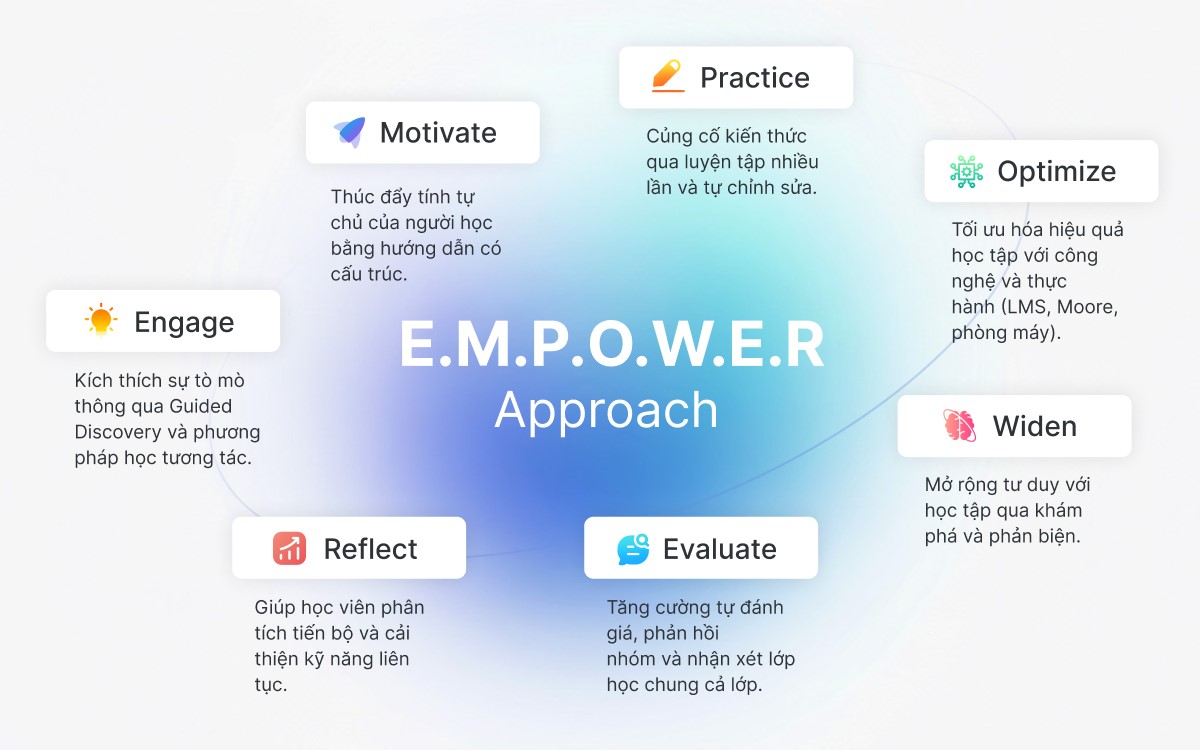 Không còn thụ động ghi chép. E.M.P.O.W.E.R® giúp bạn tự khám phá, thực hành, nhận feedback tức thì và thấy rõ sự tiến bộ sau mỗi lần học.