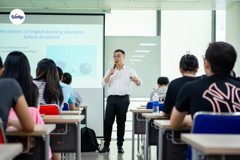 Đại diện Vietop, thầy Nguyễn Hoàng Anh Tuấn – Quản lý Đào tạo Vietop English, đã mang đến phần chia sẻ đầy cảm hứng về phương pháp học tiếng Anh & IELTS hiệu quả trong kỷ nguyên AI, nhấn mạnh tầm quan trọng của việc ứng dụng công nghệ để cá nhân hóa lộ trình học.