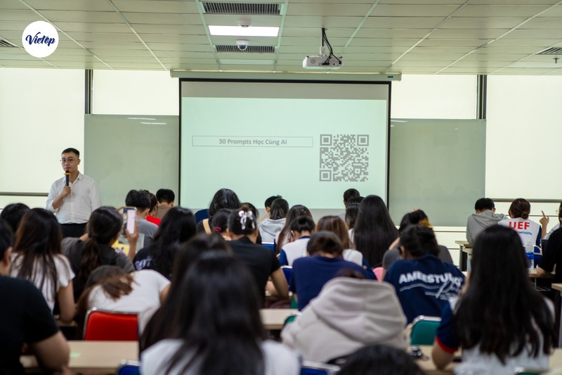 Buổi học diễn ra sôi nổi khi sinh viên UEF tích cực trao đổi, khám phá cách ứng dụng AI hiệu quả. Bên cạnh đó, thầy cũng chia sẻ nhiều tài liệu học tập hữu ích như 30 prompts học IELTS với Chat GPT, các chatbot luyện tập nhằm hỗ trợ tự học tiếng Anh hiệu quả cho các bạn sinh viên.